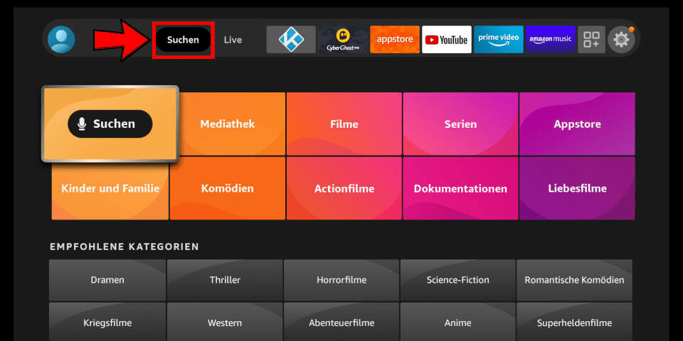 1) In the Android TV or Fire TV main menu, navigate to the “Search” entry and select the “Search” tile.