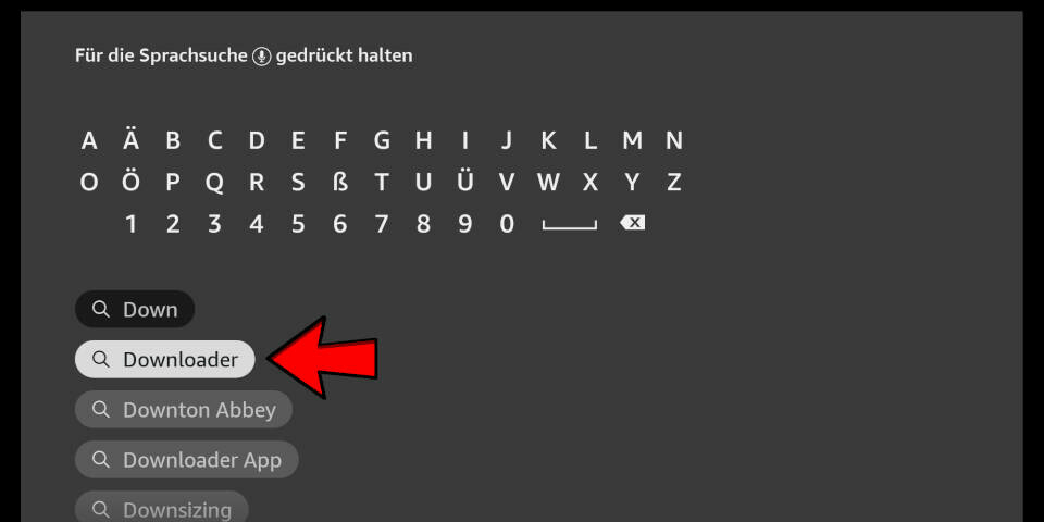 2) Enter the first letters of the word “Downloader” as a search term and select the corresponding search result using the arrow keys and the enter key on your remote control.